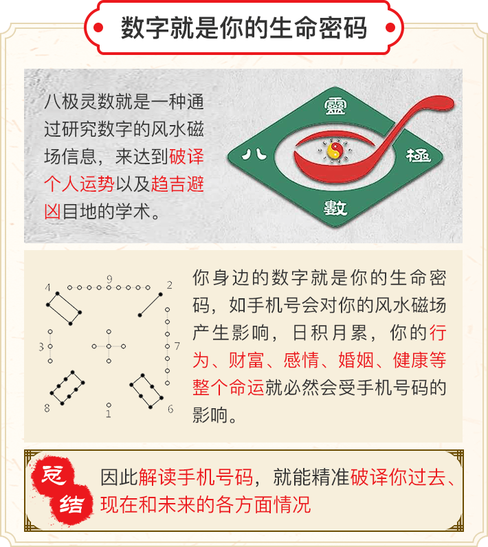 《易经》被称为六经之首。相传孔子读易曾”韦编三绝“。易经的主要内容可总结为”理、象、数“。理即是哲学的道理;象,即是宇宙万物的现象;数,即是用术数(数学)的模式来表示事物的变化规律和联系,故我们常说要“心中有数”,而手机号码和车牌号码对我们的人生命运影响甚大。